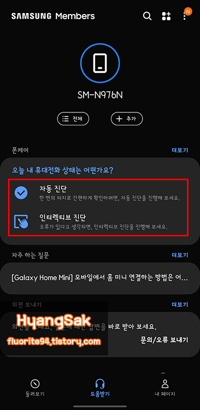 하단 자가진단 – 휴대폰 진단 기능을 이용하면 배터리는 물론, 터치스크린, 센서, 충전상태까지 쉽게 확인할 수 있습니다.
