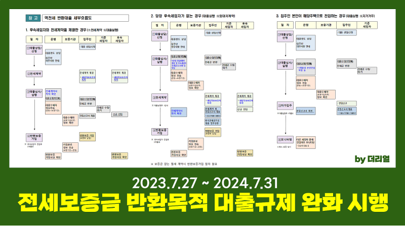 3. 대출금은 수취인에게 직접 지급되므로 주택 소유자가 대출금을 다른 용도로 사용할 수 없습니다.4. 대출 기간 동안 주택 소유자는 새 주택을 구입하는 것이 제한됩니다. – 신규주택구입시 대출일시금상환, 담보대출 3년간 금지, 전세환급대출 규제완화 개요 – 차후 세입자 보호1. 차후 임차인은 공인중개사를 통해 계약을 체결하고, 보증금반환보증에 가입하기 위한 특약서를 작성해야 합니다.2. 전입신고와 확정일자가 있는 특별보증보험에 가입해야 합니다. 3. 은행에서는 임대인의 보증보험 가입 여부를 확인한 후 지원을 제공합니다. 4. 집주인은 임차인 입주 후 3개월 이내에 보증보험 가입 의무를 무조건 이행해야 합니다. 5. 3개 보증보험사는 한시적으로 새로운 특별보증보험 상품을 운영합니다. 특별보증보험 – 없음 한도 내에서 1년 동안 운영되며, 테넌트 청약 상품과 임대 청약 상품을 운영합니다. 역임대료반환대출 규제완화 핵심요약 – 시행목적 임대보증금 상환 문제는 임차인의 임대료 상환 지연으로 인해 임대시장의 어려움을 가중시킬 수 있어 문제를 일시적으로 완화하여 시장충격을 최소화하고자 하는 것이다. 재배치. 이러한 조치는 가계부채 증가, 전세금 미반환 등의 부작용을 예방하기 위해 집주인의 자력 상환능력 점검, 임차인 자치구 대책 시행 등 제도적 보완조치가 엄격히 이행될 수 있도록 관리하겠다고 밝혔다. 후속 임차인 예금.