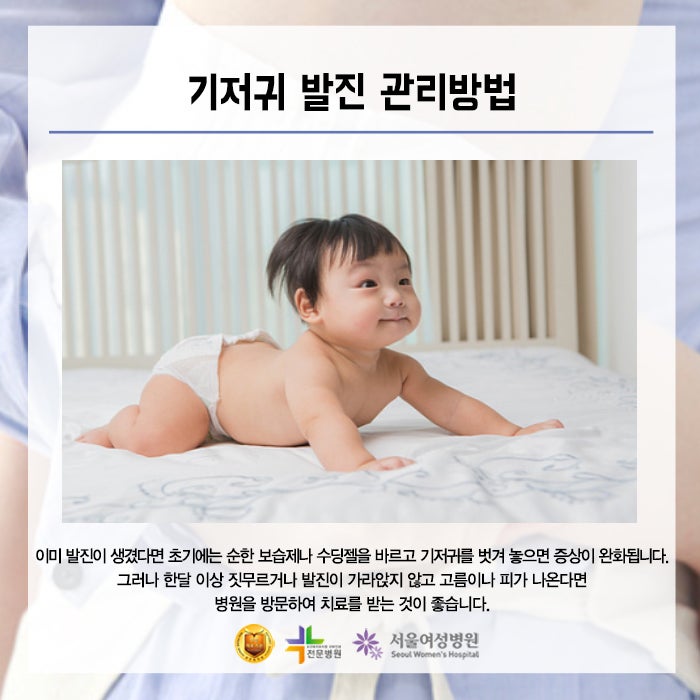 기본적으로 기저귀는 너무 조이지 않아야 하며(특히 복부와 허리 둘레), 배변이나 배뇨 후에는 가능한 한 빨리 갈아 주어야 합니다. 물티슈를 자주 사용하는 것도 아기 피부에 자극을 줄 수 있으므로 기저귀를 갈 때마다 미지근한 물로 닦아주는 것이 가장 좋습니다. 물로만 청소하기는 어렵지만 엉덩이 클렌저가 요즘 유행이라 같이 사용하면 향도 은은하고 잔여물도 남지않고 청소하기도 편해요.