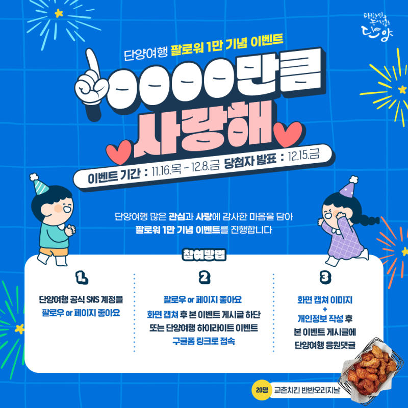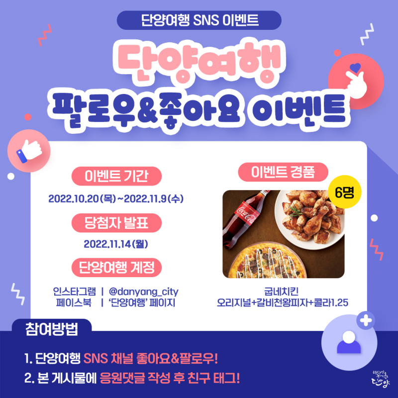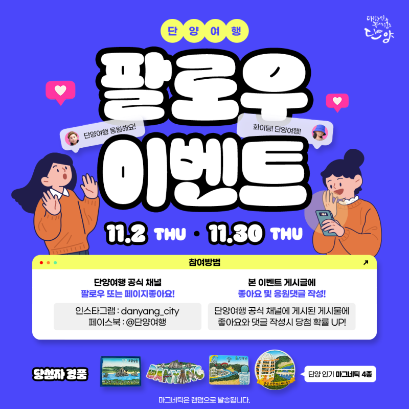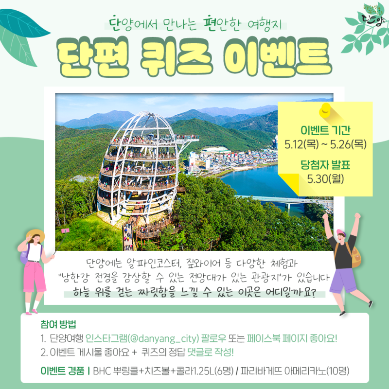 참여방법 ① 단양여행 계정(네이버 블로그, 페이스북, 인스타그램)을 팔로우하세요! ② 봄을 맞아 단양에서 하고 싶은 일을 이벤트 게시물에 댓글로 남겨주세요! ③ 댓글 화면과 팔로우 화면을 캡쳐하여 구글폼에 제출합니다. 완료! 팁! 앞으로 나올 단양 여행 포스팅에 좋아요와 댓글을 남겨주시면 당첨 확률이 UP!⠀