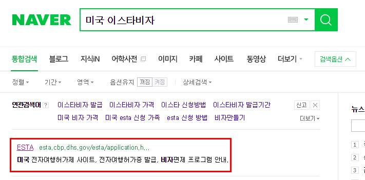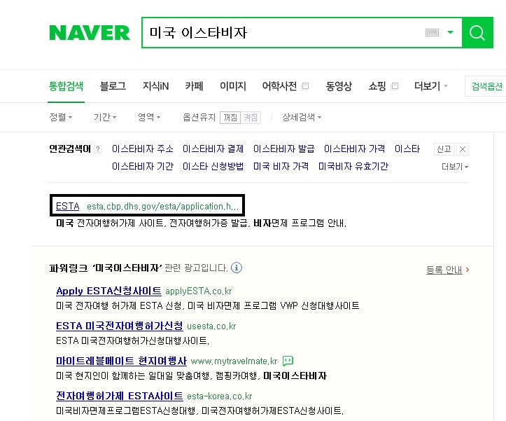 네이버에서 ‘이스타 비자 신청’을 검색했어요. 그리고 가장 먼저 나오는 esta.cbp.dhs.gov 를 클릭하세요. 누구나 따라서 할 수 있으니, 비용을 들여서 대행업체를 쓰지 않으셔도 된답니다.