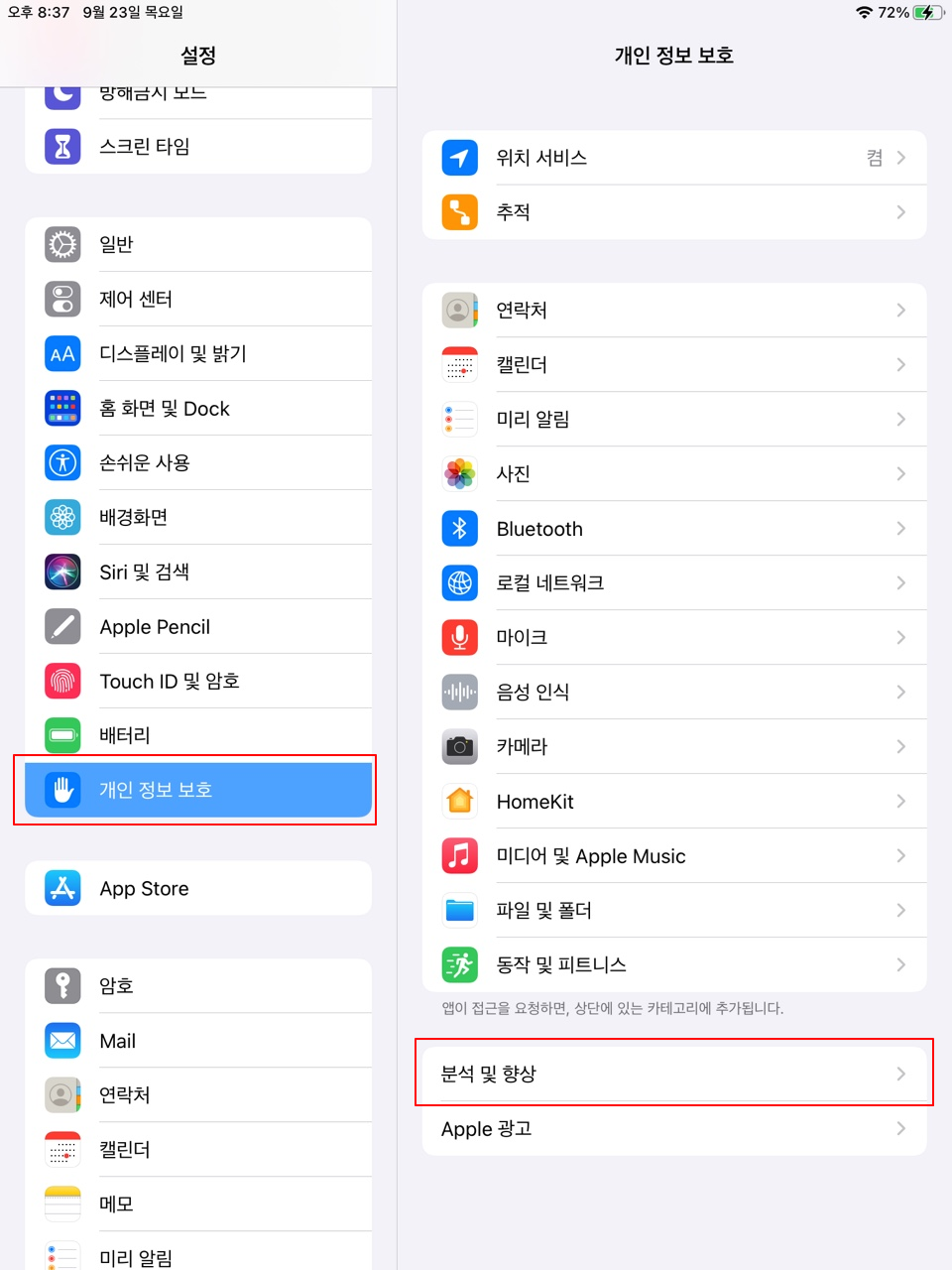 1. 개인 정보 보호 및 보안 – 분석 및 강화 메뉴를 찾으세요. iPad 내부 로그에서 배터리 주기와 성능을 확인하려면 설정의 개인 정보 보호 및 보안 – 분석 및 향상 메뉴로 이동하세요.